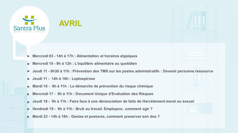 Santra Plus vous propose des séances de sensibilisation et d'information sur différentes thématiques.Â